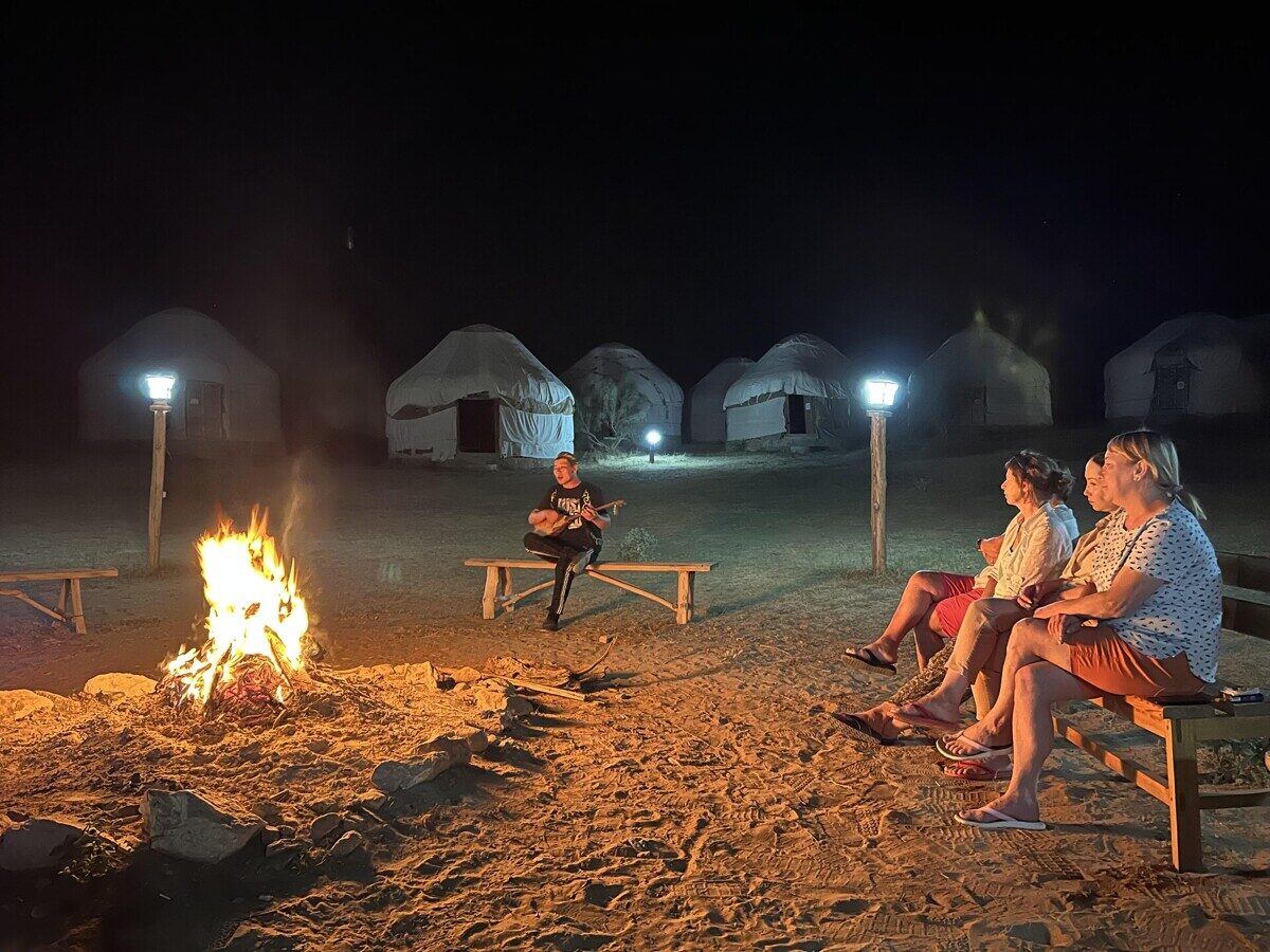 6. diena: Tuksneša eksotika un Aidar ezers Šodien atstāsiet pilsētas kņadu un dosieties piedzīvojumā cauri Nuratas kalniem uz Kizilkuma tuksnesi. Mērķis ir Aidar ezers – "zilās jūras brīnums tuksnesī". Tā ir unikāla vieta, kur sāļūdens ezers kontrastē ar tuksneša ainavu, un apkārtnē iespējams manīt stepju lapsas un dažādus putnus. Ierodoties apmetnē, iekārtosieties tradicionālajās jurtās – apaļās teltīs, kādas gadsimtiem ilgi izmantojuši klejotāji. Būs iespēja peldēties siltajā ezera ūdenī vai vienkārši baudīt dabas mieru. Vakarā jūs gaida tradicionālas uzbeku vakariņas pie ugunskura, klausoties tautas mūziku un vērojot zvaigžņotās tuksneša debesis. Nakšņošana jurtās.